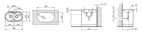 - Corte en la encimera:760 x 420 mm, ángulo de radio de 10 mm.